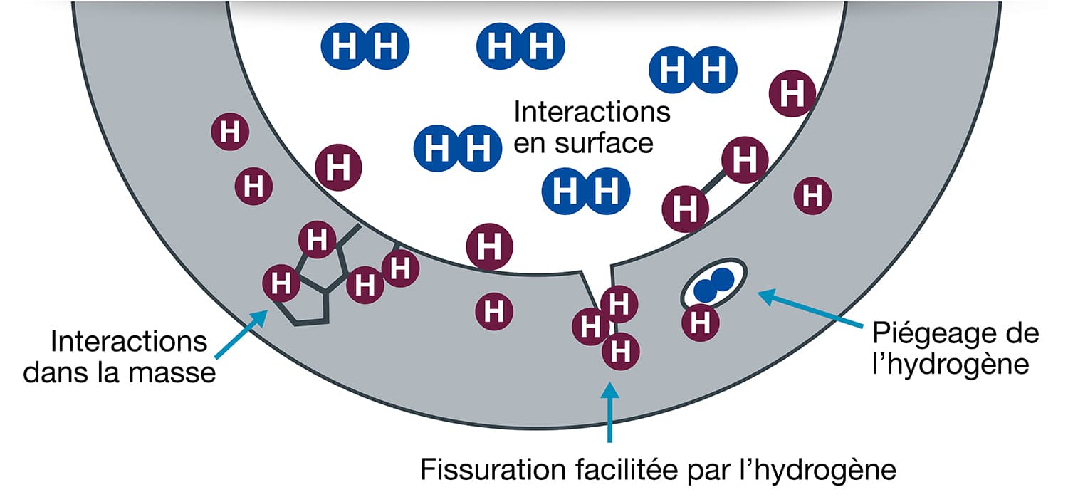 L’hydrogène pénètre dans les métaux lorsque des molécules de dihydrogène stables se transforment en atomes d’hydrogène. En générale, les atomes d’hydrogène s’amalgament là où se concentrent des contraintes – extrémités de fissure, caractéristiques microstructurales telles que les limites intergranulaires, inclusions, précipités (Figure 2).