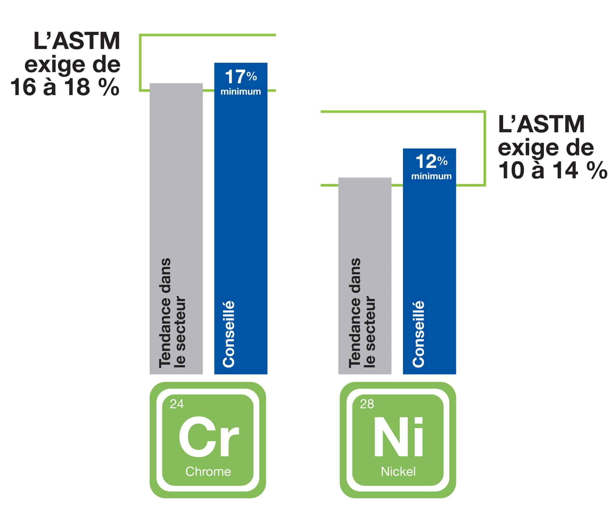 Des essais ont montré que les aciers inoxydables aux teneurs élevées en nickel et en chrome résistent mieux à la fragilisation par l’hydrogène par rapport à des aciers moins fortement alliés. Si l’American Society for Testing and Materials (ASTM) impose une teneur minimale en nickel de 10 % dans la composition de l’acier inoxydable 316, un acier contenant au moins 12 % de nickel sera plus adapté aux problèmes particuliers posés par l’hydrogène (Figure 3). La teneur en nickel aide à stabiliser la microstructure de l’acier inoxydable, ce qui le rend plus résistant au phénomène de fragilisation par l’hydrogène. Lors d’essais réalisés par Swagelok, il a été constaté que l’effet de ce phénomène sur la ductilité en traction de l’acier inoxydable 316 contenant 12 % de nickel était minime.