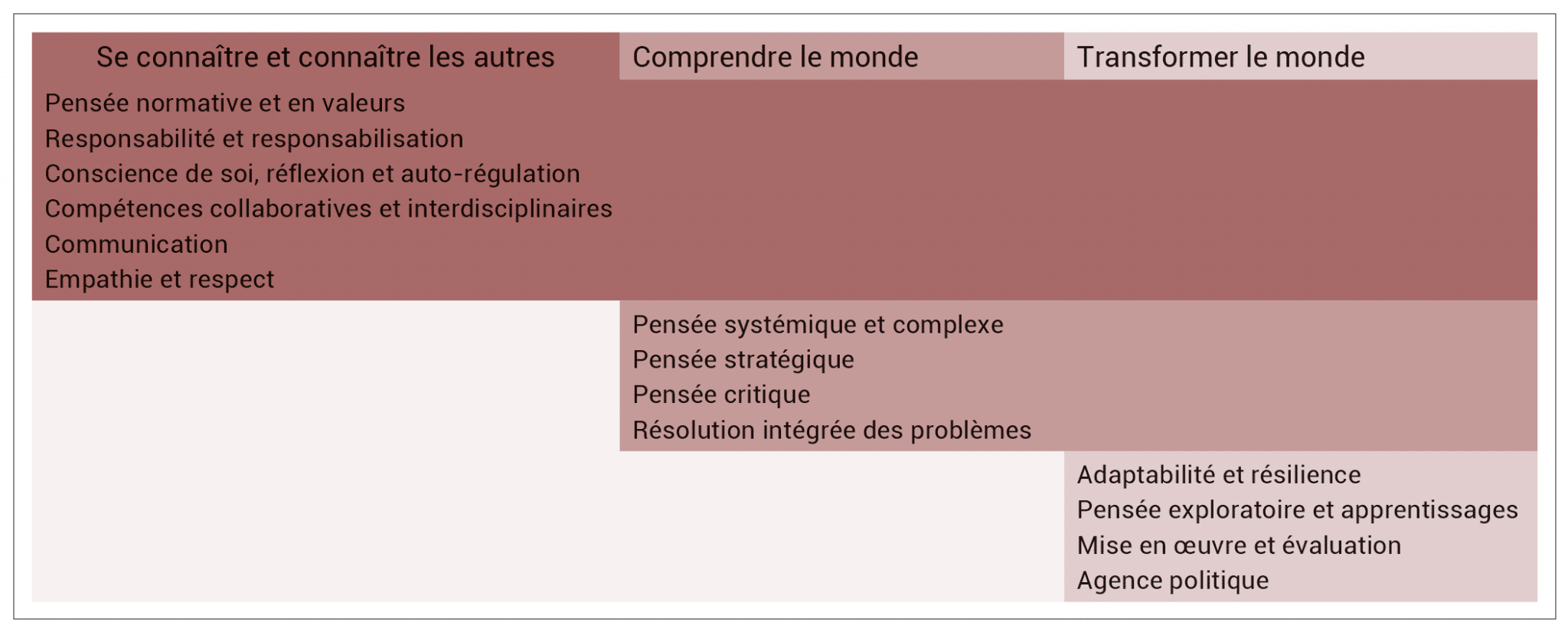 Les compétences sont en effet déjà connues. La littérature académique – par exemple Redman et Wiek (2021), Moosmayer et coll. (2020) ou encore Lozano et Barreiro-Gen (2021) – ainsi que les rapports internationaux, dont ceux de l’Union européenne, de l’UNESCO ou de l’OCDE, convergent depuis plusieurs années vers un ensemble clair de compétences.