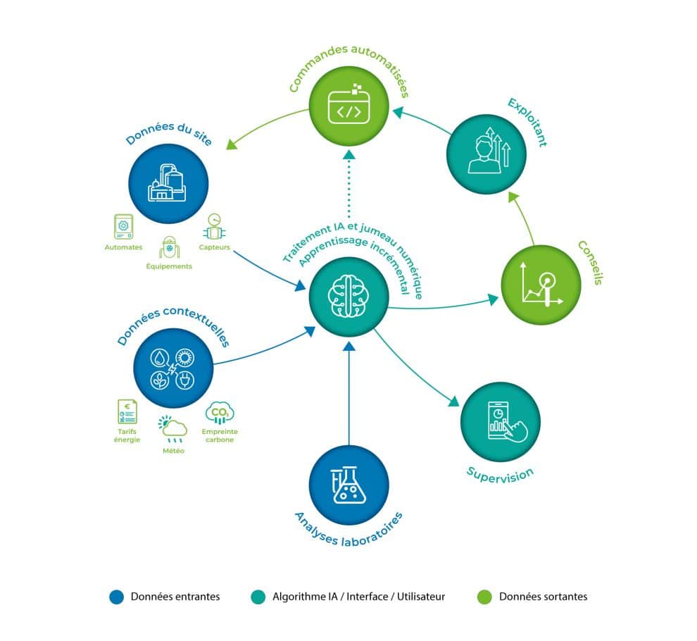 L’ensemble de ces données associé à un système temps réel d’optimisation du process, rendu possible par l’utilisation d’algorithmes d’intelligence artificielle (machine learning), permet la gestion des énergies, la prédiction et maximisation de la production Biogaz, la maintenance prédictive (détection d’anomalies), le pilotage de certains organes et le guidage de l’exploitation.