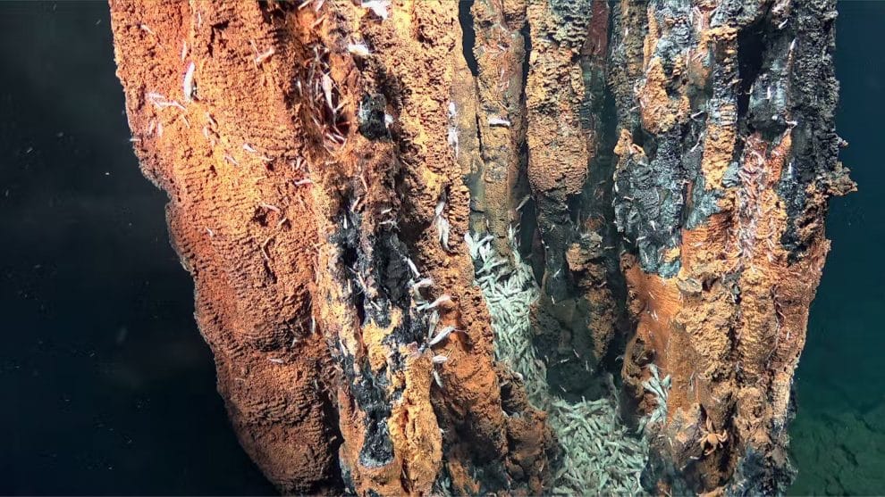 Photo ci-dessus : Cheminée hydrothermale sur la zone d’étude. Image prise par « Victor », le robot télécommandé qui plonge à 2 000 mètres de fond et ramène des échantillons. Ifremer, Fourni par l’auteur