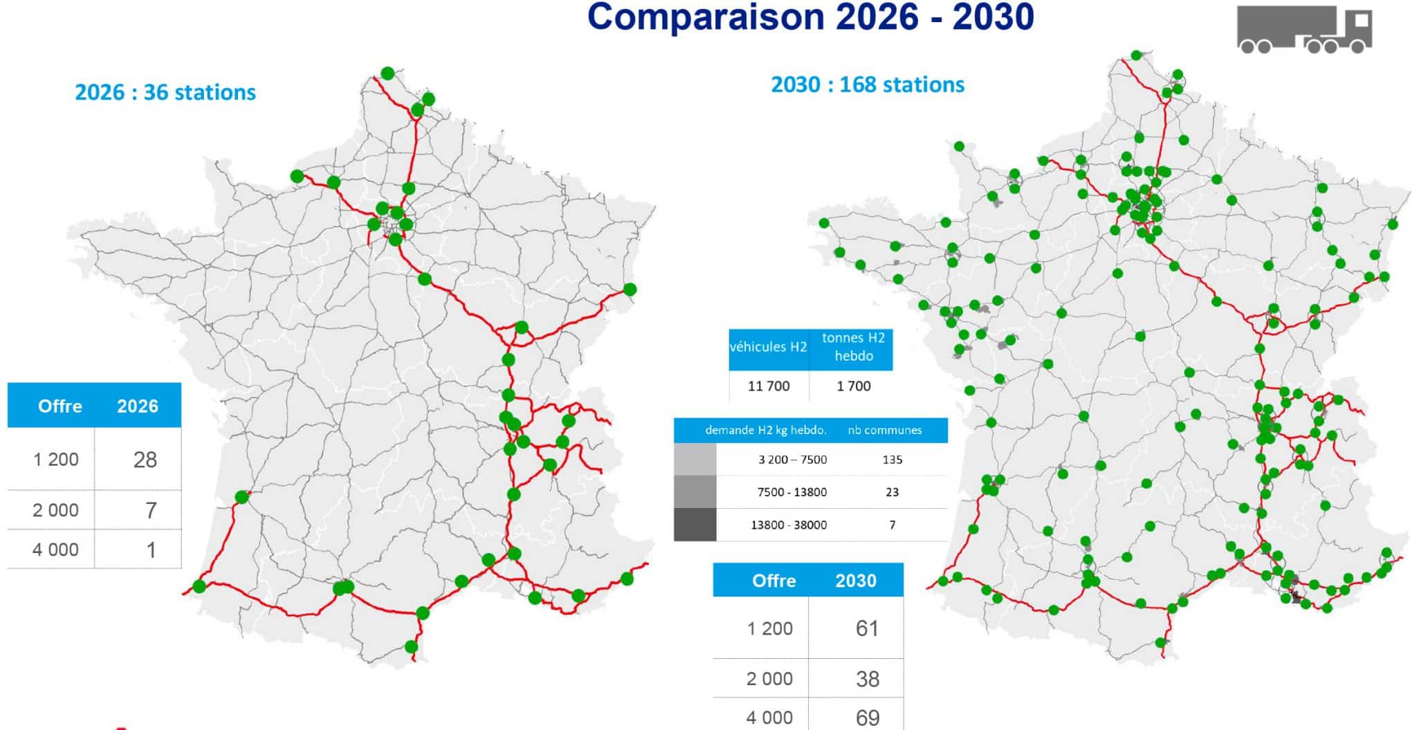 France Hydrogène et la Plateforme automobile (PFA) avec l’IRT SystemX ont réalisé une modélisation des besoins en infrastructures de recharge hydrogène pour la mobilité terrestre en France métropolitaine à l’horizon 2030 avec un point de passage à 2026.