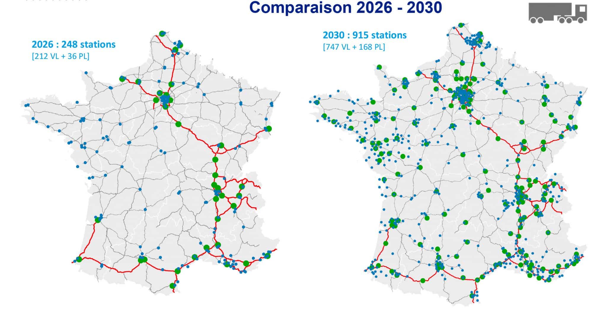 À l’horizon 2030, l’infrastructure de recharge cumulée VL et PL approche donc les 1000 stations hydrogène sur le territoire national en cohérence avec les objectifs des scénarios de référence de la Stratégie nationale hydrogène et ceux des études prospectives « Trajectoire pour une grande ambition hydrogène », réalisées par France Hydrogène.