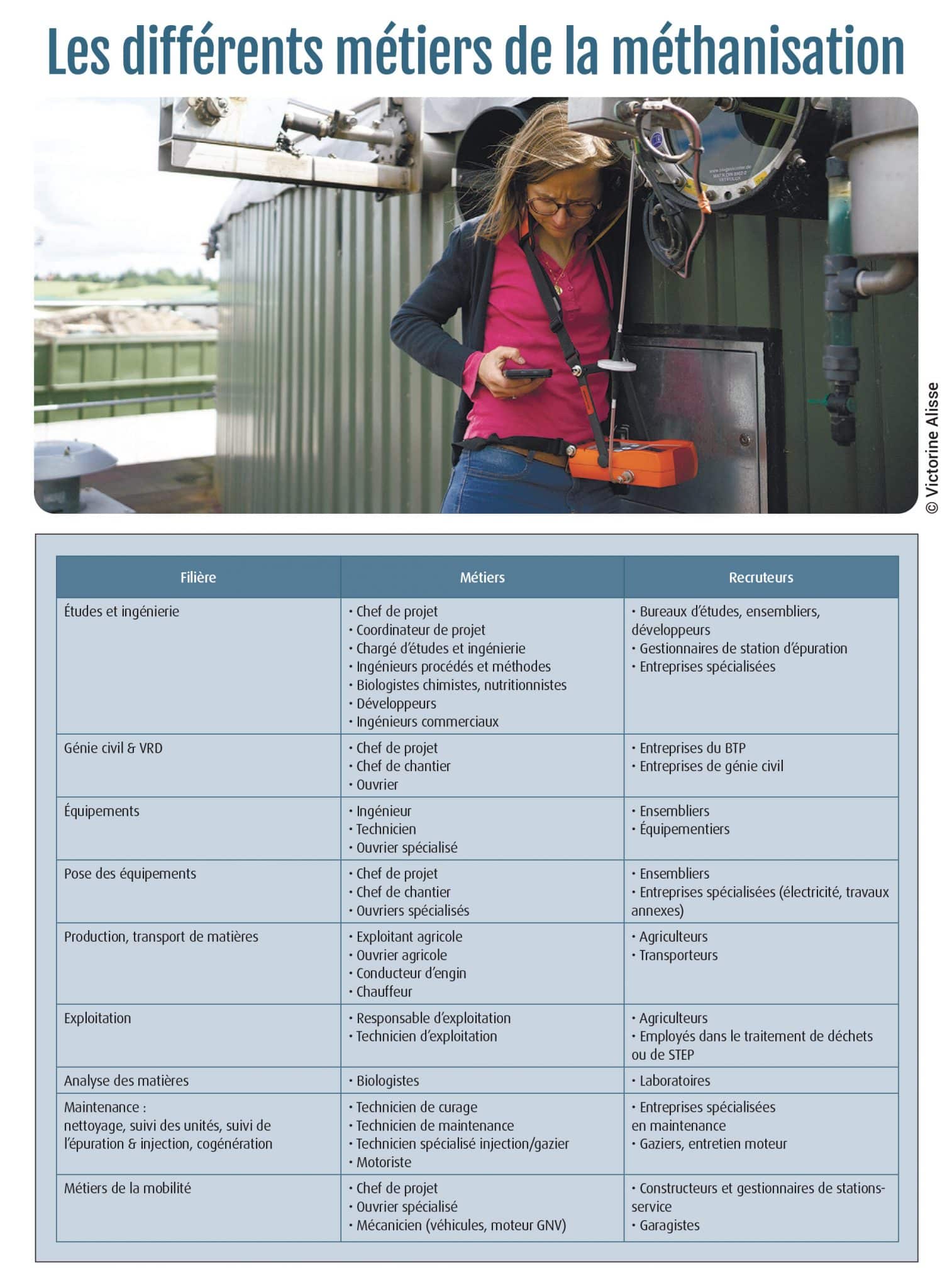 Le secteur du biogaz crée des emplois sur des postes très variés, les profils recherchés allant du niveau bac à bac + 2/3 pour les techniciens et à bac + 5 en ingénierie. La filière recrute aussi des personnes ayant une expérience dans le secteur, mais aussi dans les filières industrielles mécaniques et de construction. Pour ce qui est des recruteurs, les très grandes entreprises côtoient les PME et les startups, sans oublier les entreprises du monde agricole.