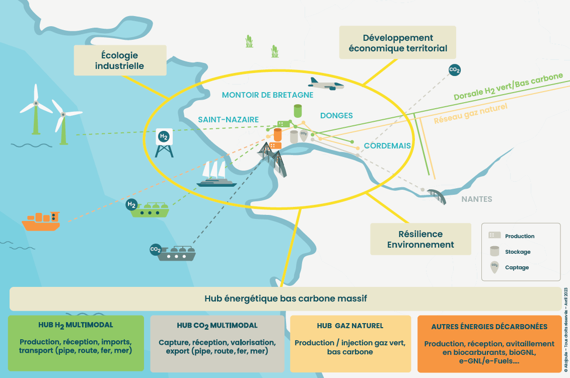 Une zone industrielle bas carbone Le territoire Loire Estuaire a été désigné lauréat de l’Appel à projet Zone Industrielle Bas Carbone (ZIBaC), porté par l’Ademe dans le cadre du programme « France 2030 ». Nantes-Saint-Nazaire, premier port de la façade atlantique, va devenir une plaque tournante des énergies décarbonées. Le site a désormais le statut d’une ZIBaC, au même titre que Dunkerque, Fos-sur-Mer et Le Havre. Concrètement, la volonté est de créer un hub hydrogène multimodal permettant la production, l’import et le transport d’hydrogène bas carbone. En parallèle, un hub CO2 multimodal (permettant la capture, la réception, la valorisation et l’export de CO2 industriel), un hub gaz naturel (pour la production et la distribution de gaz renouvelable/bas carbone) ainsi qu’un pôle dédié aux autres énergies décarbonées permettant la production et l’avitaillement en biocarburants, bioGNL, biofuels… seront créés. Le programme d’actions de 8,2 millions d’€ sur deux ans est soutenu à hauteur de 4,1 millions d’€ par l’Ademe. Précisons encore que le port de Saint-Nazaire est situé à proximité des gisements éoliens offshore (premier parc éolien offshore de 480 MW, première éolienne flottante avec 20 GW de potentiel). Le territoire Loire Estuaire se caractérise par une plateforme énergétique majeure assurant 10 % de l’approvisionnement énergétique de la France.