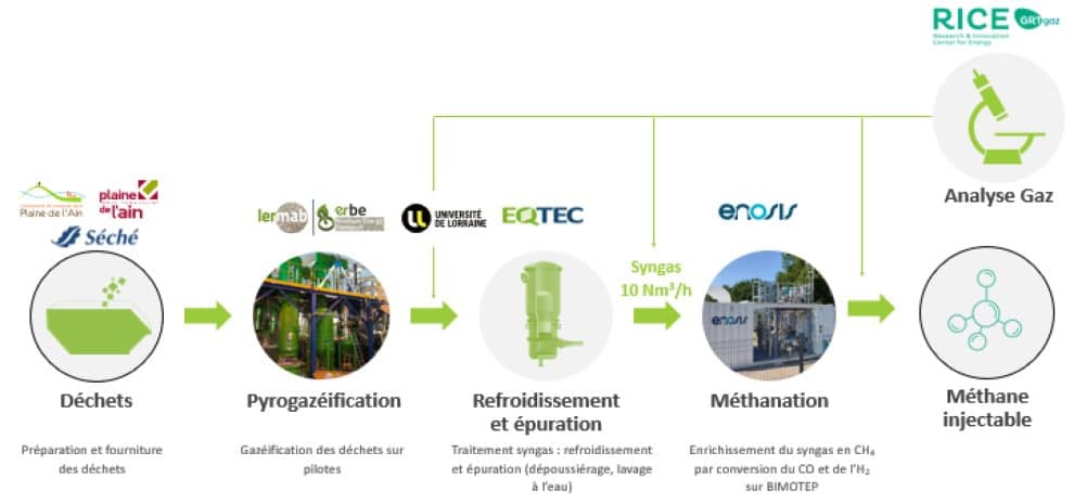 La CCPA, le SMPIPA, GRTGaz, Séché Environnement et Enosis engagent désormais la seconde phase : la mise en œuvre d’un démonstrateur à l’échelle semi-industrielle. Celle-ci consiste à coupler un procédé de pyrogazéification et de méthanation biologique afin de valider la qualité du gaz produit à partir de déchets solides de la Plaine de l’Ain (bois en fin de vie, encombrants de déchetterie, déchets d’activités économiques, etc.) difficilement valorisables par les filières classiques. L’objectif de ce partenariat est de confirmer l’intérêt de cette solution de traitement déchets, pour aboutir à une production locale de gaz renouvelable et bas-carbone. Il s’agit d’une démonstration à échelle semi-industrielle, conduite au sein de la plateforme ERBE du LERMAB (Laboratoire d’études et de recherche sur le matériau bois) de l’Université de Lorraine, situé à Épinal au sein du campus Bois.