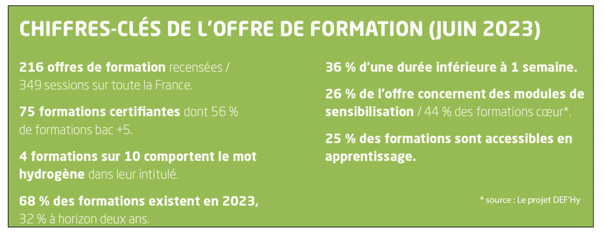Source : Rapport final du projet DEF’Hy, lauréat de l’appel à manifestation d’intérêt « Compétences et Métiers d’Avenir » réunissant les acteurs emblématiques de l’emploi et la formation, l’AFPA, EIT Innoenergy, France Travail, RCO-Le Réseau des Carif-Oref, Adecco Digital France et France Hydrogène.