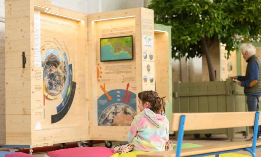 Les contenus scientifiques – accessibles à partir du CM1 — ont été travaillés avec une agence spécialisée dans la création d’expositions, Carte Blanche, avec qui nous travaillons depuis le Train du climat en 2015. Le visiteur franchit trois espaces successifs commençant par la compréhension des mécanismes scientifiques, puis le rôle des humains, et enfin les actions possibles à l’échelle individuelle est collective. C’est un cheminement permettant de comprendre le nécessaire avant de passer à l’espace suivant, puis de terminer par les solutions. Le visiteur est pleinement acteur : il peut manipuler des mécanismes, les plus low tech possible, souvent en bois.