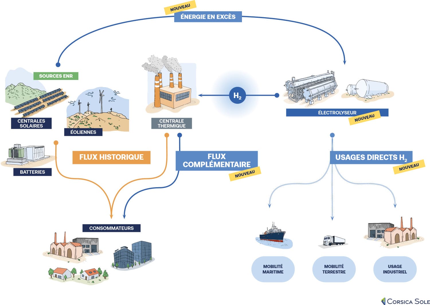 Corsica Sole a toujours cherché des solutions adaptées aux défis énergétiques des territoires insulaires. En Corse, où nous sommes le principal producteur solaire, les réseaux électriques saturés limitent la pleine exploitation des énergies renouvelables. En 2022, nous avons décidé d’explorer l’hydrogène comme un complément idéal : il permet non seulement de stocker massivement les surplus d’énergie solaire, mais aussi de décarboner des usages difficiles à électrifier, comme le transport maritime.