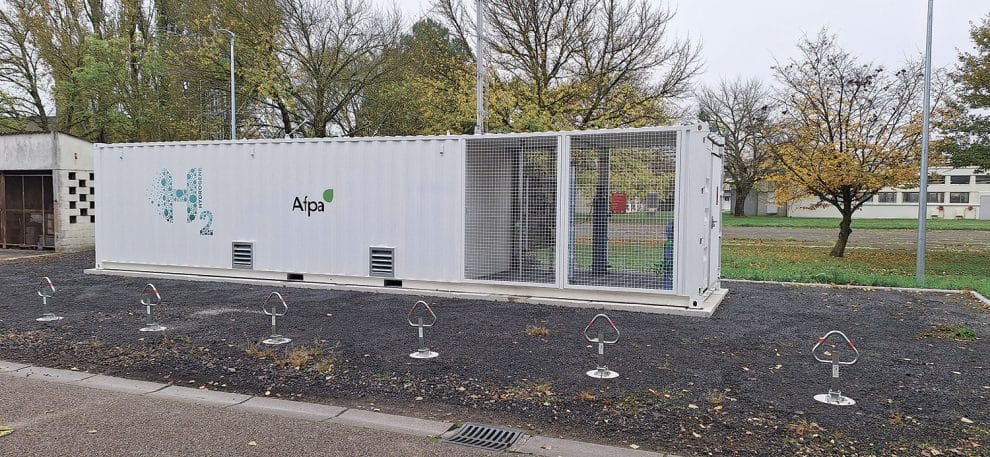 Légende de la photo ci-dessus : Démonstrateur hydrogène mobile installé à Metz, conçu en partenariat avec ERM. Ce container itinérant intègre un électrolyseur, une pile à combustible et un système de stockage, et peut être déplacé entre différents centres de formation.