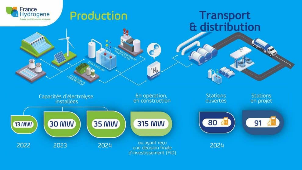 En 2024, la capacité d’électrolyse installée atteint 35 MW, en légère hausse par rapport à 2023 (30 MW). Cette croissance reste modeste mais s’inscrit dans un cycle industriel long, notamment avec l’intégration de la production sur site dans de nouvelles stations comme celles de Dijon ou Étrez (projet Hypster).